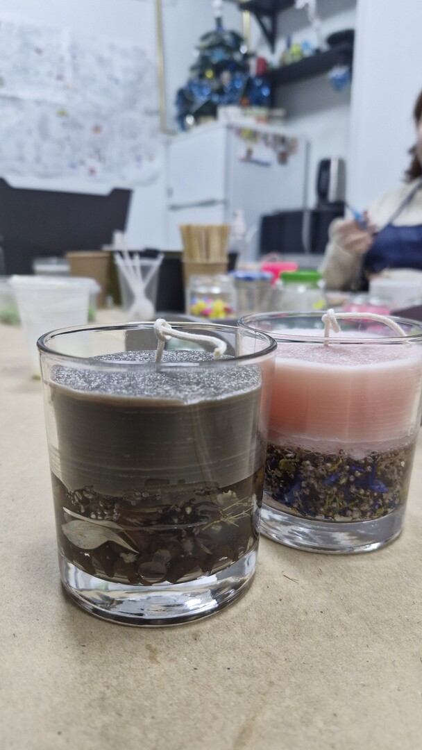 Новачки дізнаються, як розчиняти матеріал для свічки (свічковий гель або пальмовий віск) на водяній бані, заливати у форми та працювати з ґнотами. Клієнти створять по дві свічки на обрану майстром тематику, використовуючи ароматизатори, барвники й сухий декор: мушлі, камінці, сухоцвіти, ґлітер та поталь.